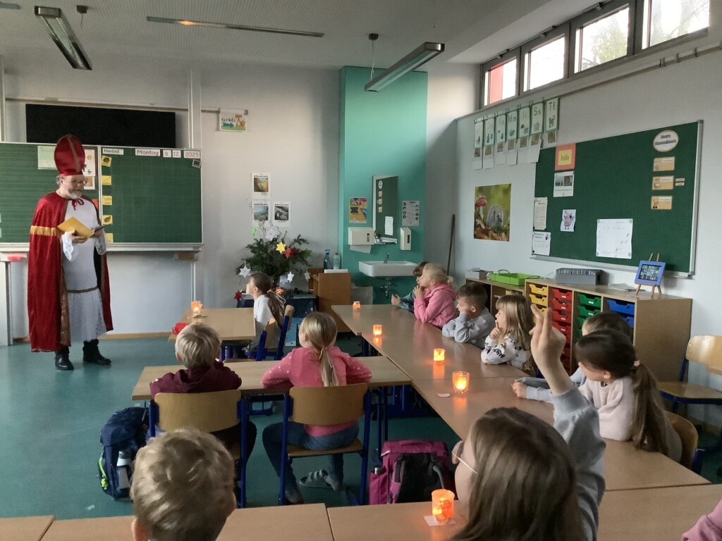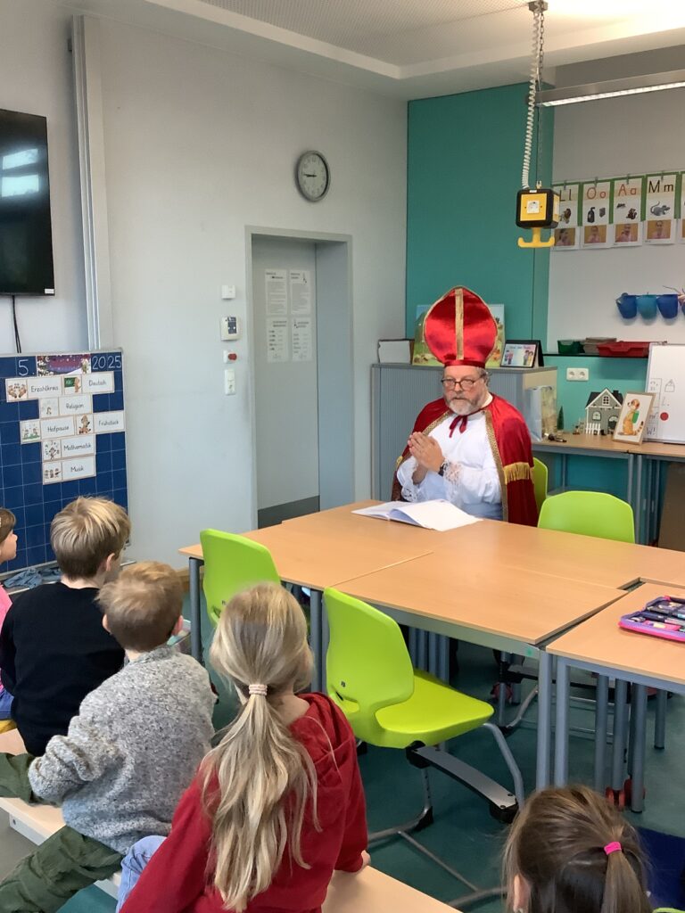Der Besuch des Nikolauses war etwas ganz Besonderes. Mit einem goldenen Buch unter dem Arm trat er am Montag leise in die Schule ein. Die Kinder des ersten Jahrgangs hielten den Atem an, als der Nikolaus näher kam, sich in den Stuhl setzte und das goldene Buch aufschlug.